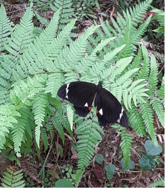 Today on Australia Day I take a short drive to a local bushland where I like to escape and appreciate nature. As I meander along the pathway looking at all the native Aussie plants, the greenery vegetation and taking in the sounds of the rainbow lorikeets high up in the gum trees, a black butterfly with white tipped wings and a dot of red at its rear captivates my attention. It lands close by on a fern leaf. I take a step closer. The butterfly flies further away. However, for a split minute, it stays still allowing me to take a photo before flying high up in the gum trees. This butterfly is a male Australian Butterfly better known as the Orchard Citrus Swallowtail Butterfly (papilio aegeus).