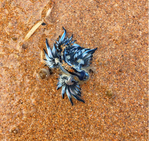 The Blue Glaucus uses the air bubble stored in it’s stomach to remain afloat atop the surface of the water. They often drift on their backsides to display to airborne predators their brightly colored underbellies, while at the same time their bright blue backside camouflages with the ocean’s surface to conceal themselves from any predators lurking below. This phenomenon is known as countershading, assisting the nudibranch to avoid creatures from both above and below, whilst floating in open waters.
