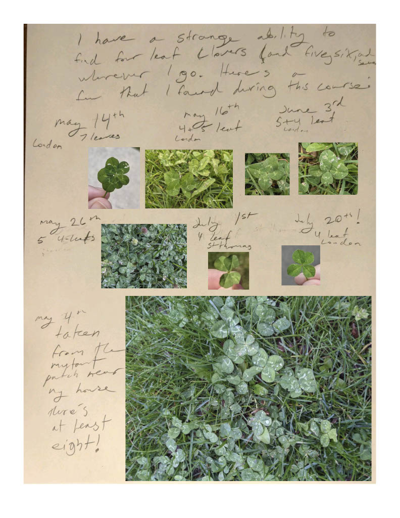 Since I was about 10, I’ve been able to find four leaf clovers pretty much everywhere I go. I even developed an instinct of sorts that allows me to very accurately guess whether a clover patch will have four leaf clovers or not. When I was younger, I could expect to find well over 150 per year.