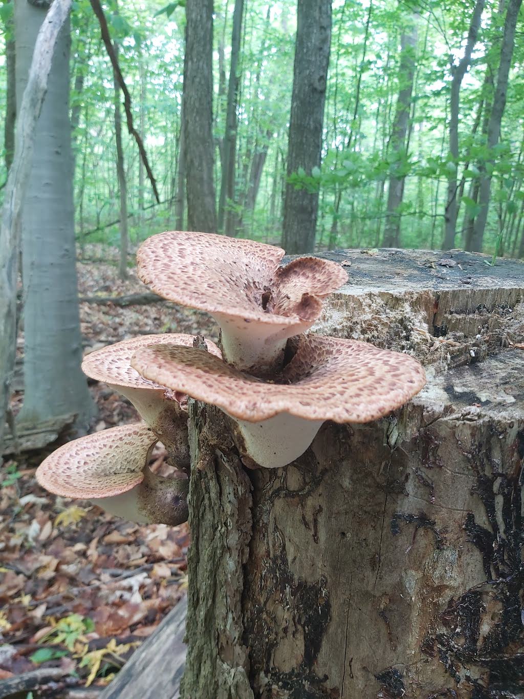 After a few weeks of not seeing anything new, I noticed some fruiting bodies of Cerioporus/Polyporus squamosus (Dryad's saddle, pheasant's back), which were coming up out of some dead hardwood stumps. A few days prior to this there were some signs of pinning, but I wasn’t sure what kind of mushroom it may be.