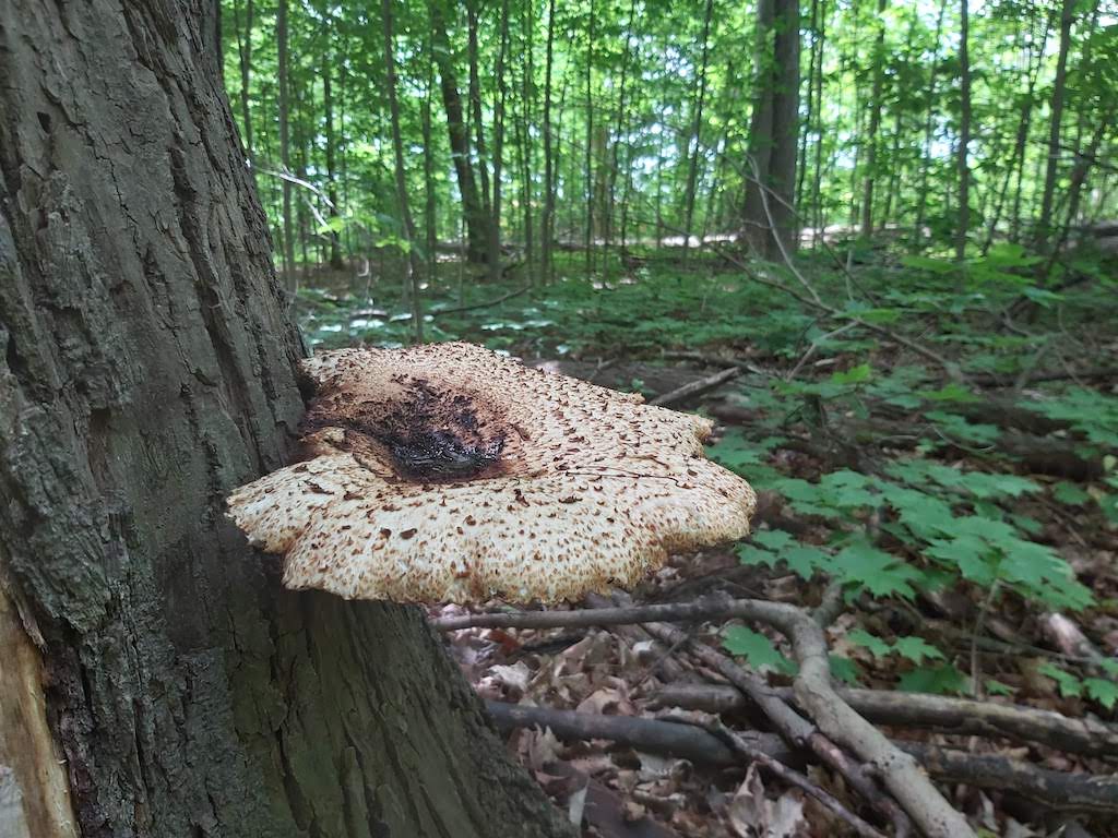Sure enough, when taking a closer look at the fungi it was most certainly Cerioporus/Polyporus squamosus, and despite only being a few days old the underside of the fungus was completely covered in insects (mostly various larvae). In the past few years a lot of the ash trees in the area had to be cut down due to the Emerald Ash Borer infestation, and while it was unfortunate to see them go, it’s nice to see that decomposers have gone to work to help with nutrient cycling and the enrichment of the forest soil.