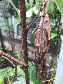 It took a long afternoon and many scratches to weed and prune the raspberry canes but a Saunders case moth or bagworm (member of the Psychidae family) proved an unlikely companion. She (I imagine she is female) as until the male emerges from his twig-encrusted home is it impossible to ascertain gender. Despite much searching I have never seen a male who has emerged to display his striking black wings and furry orange head. Instead the home-body females trundle slowly over concrete, soil, leaves, even glass in their silken shelters to which they have painstakingly attached chewed off leaves and twigs. This particular case moth has thoughtfully perused the raspberry leaves, occasionally nibbling a new leaf, while snail-like towing her humble dwelling. Her shelter has a simple beauty; it is her material paradise where, wingless, I think of her as living her entire life bound within her enclosure of contented memories and dreams. In this time of Covid-19 when we, like the case moth, must also be home-bodies, home is where the heart has to be. An afternoon with the case moth has taught me that home is more than a mere shelter. It is an intimate space in which to dream in peace.