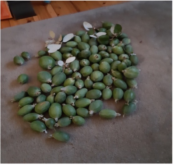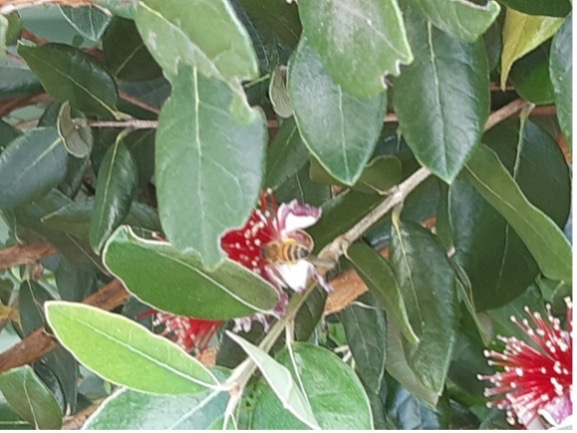 Looking up to the heavens I notice not just flowers but fruit waiting to be picked and eaten. Oval shaped fruit, green on the outside, a pale shade of yellow on the inside. I stand on tippy-toes stretching my arms to the sky, clutching at the fruit before it falls to the ground. As I touch the fruit many drop into my hand and, not long after, my bag is full. The tree is a Feijoa tree (aka pineapple guava). I grow Feijoa trees in my garden, and, after a number of years, my Feijoa trees are now flowering and I'll have Feijoas fruiting too.