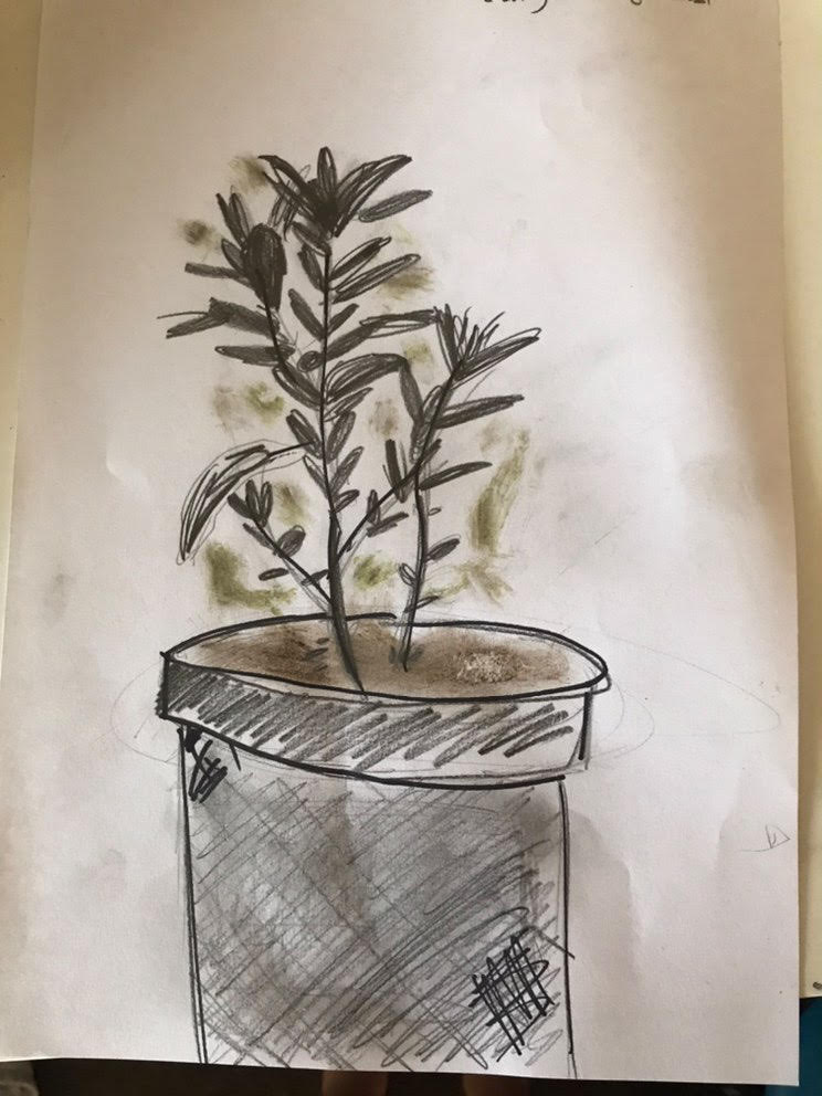 I decided to colour but thought that pencils wouldn’t show the earth like feel I was going for, so I look around for a bit and realised that I had all the colour right in-front of me, so I got some mint leaves that had fallen of and some dirt and smeared it around the picture to add a more plant like feel.