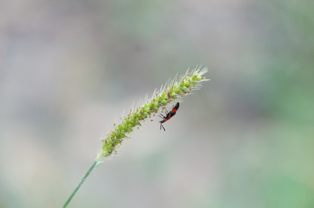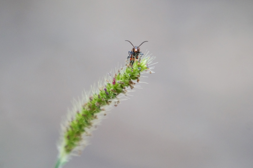 A skinny tiny critter 10mm long and 2mm wide climbing a pigeon grass stalk...sees me & heads back down...turns & heads back up...hiding from me behind the stalk seed head...arrives at the summit...eyeing me then surveying the view from way up there..click, click.