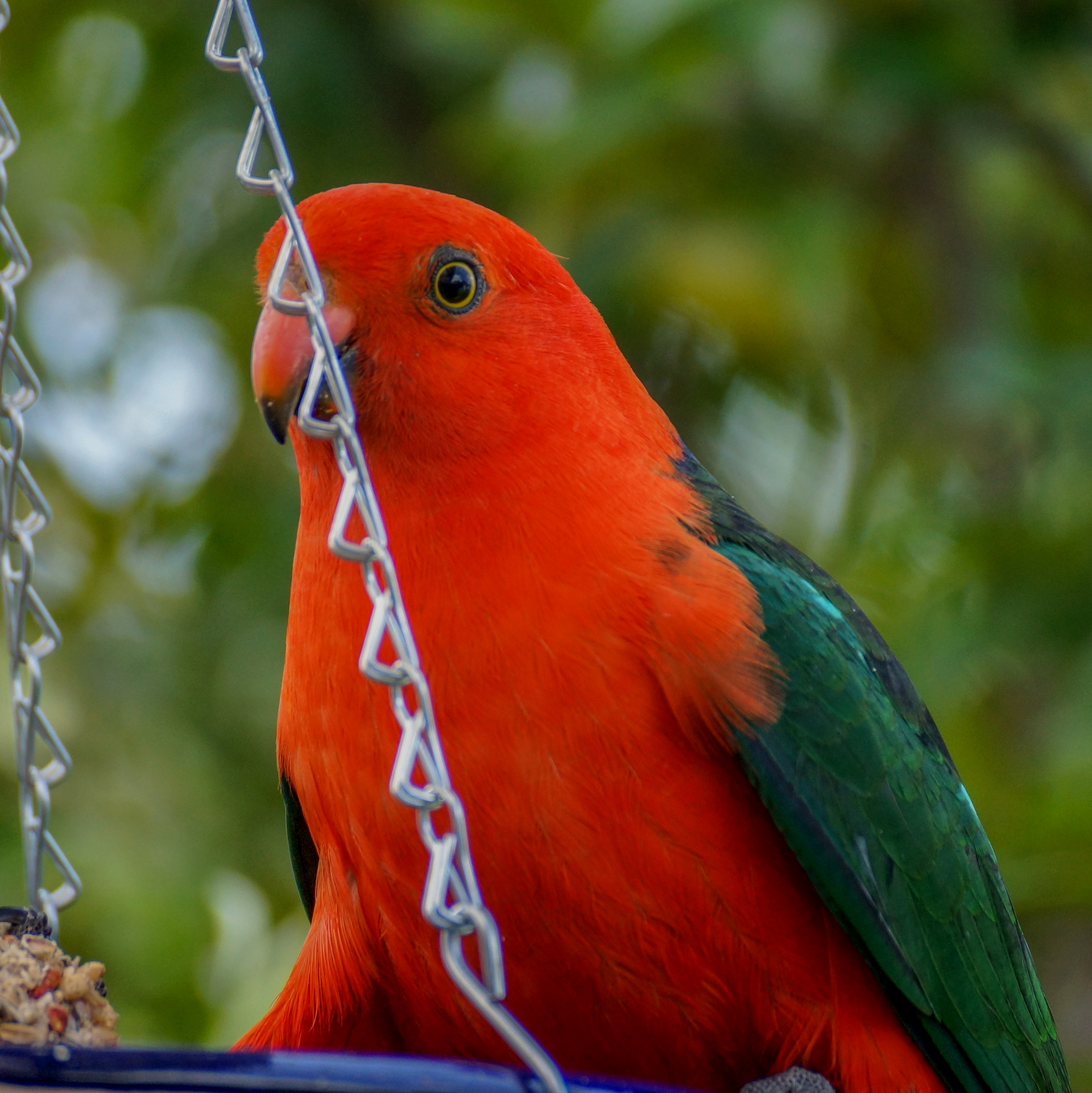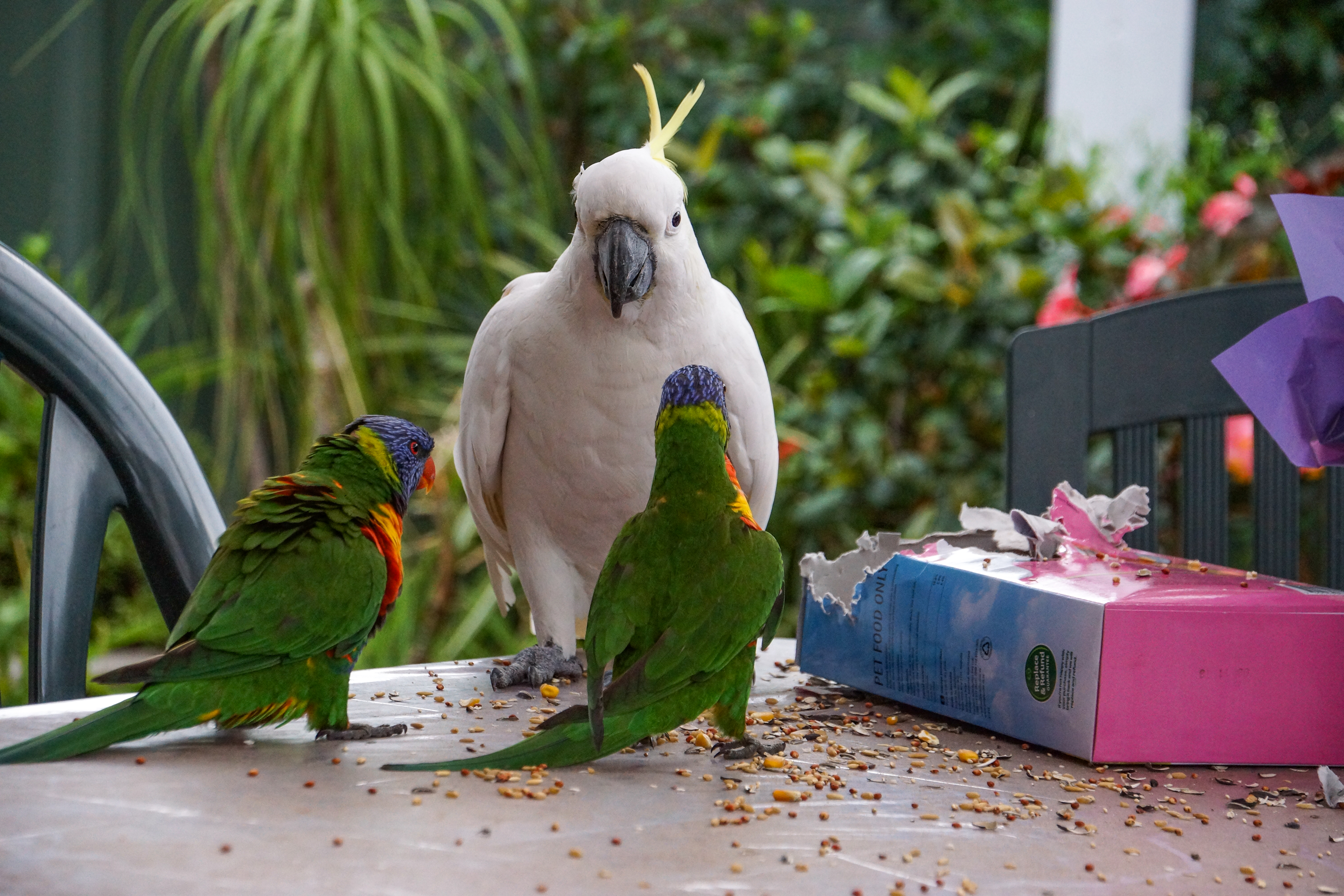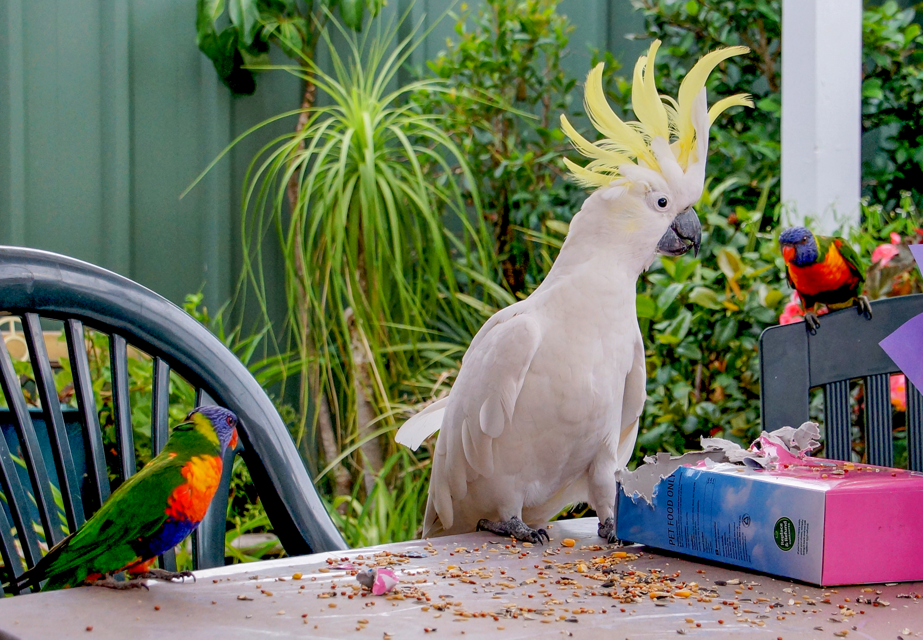 Noticing a pair of King-Parrots resting under my pergola, I put out a seed bell for them. I soon realised that a regular pair of visiting Rainbow Lorikeets (Squawky and his Missus) had also discovered the feast. Not good for them! Then a Sulphur-crested Cockatoo also discovered the seed bell. I suspect the lorikeets and cockatoo chased the King-Parrots away. I decided to put the seed bell out after the lorikeets had left my garden for the cockatoo. The seed bell soon got eaten, but all I could get was loose seed. I left the packet on the table, ready for filling the feeder the next time the cockatoo visited.