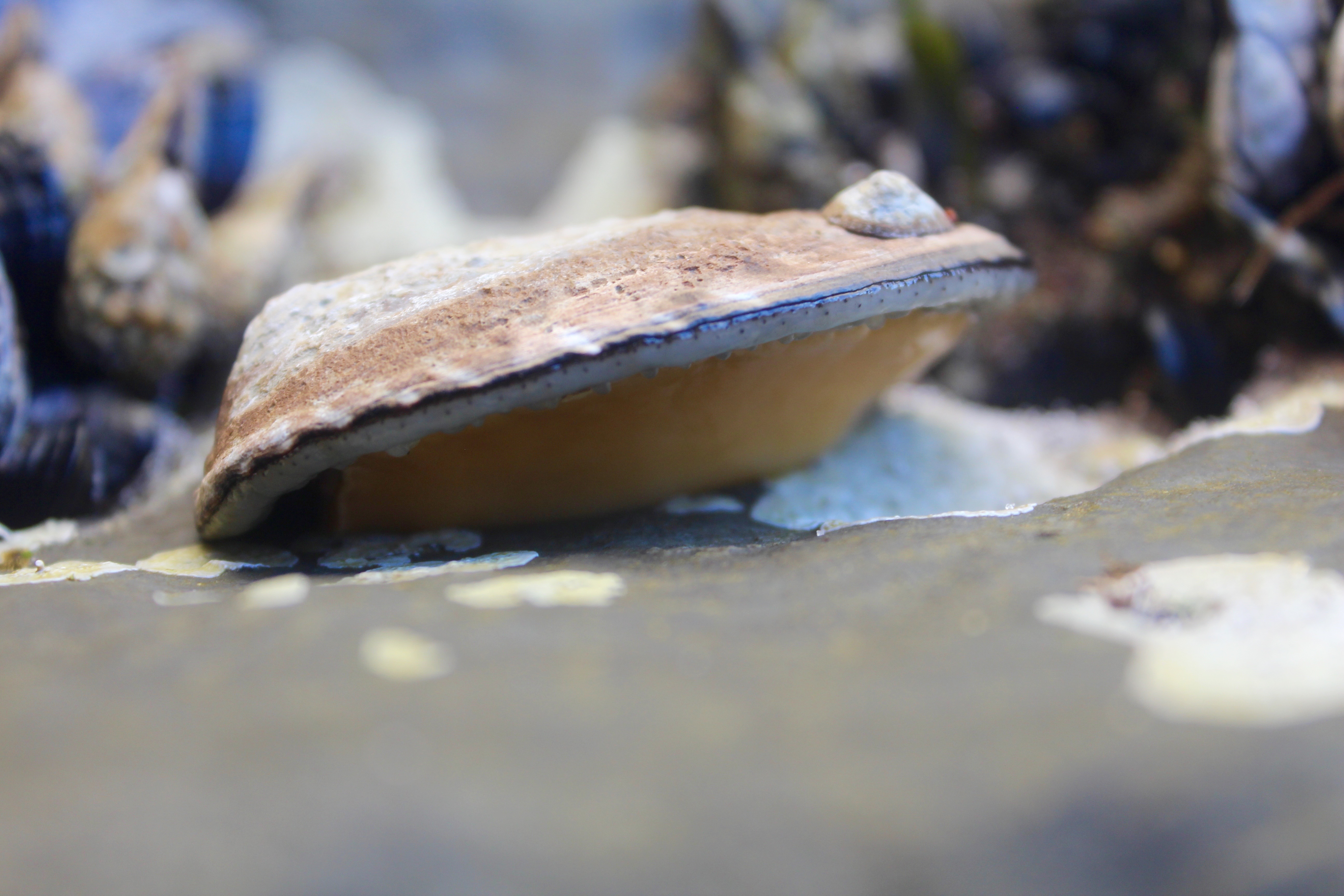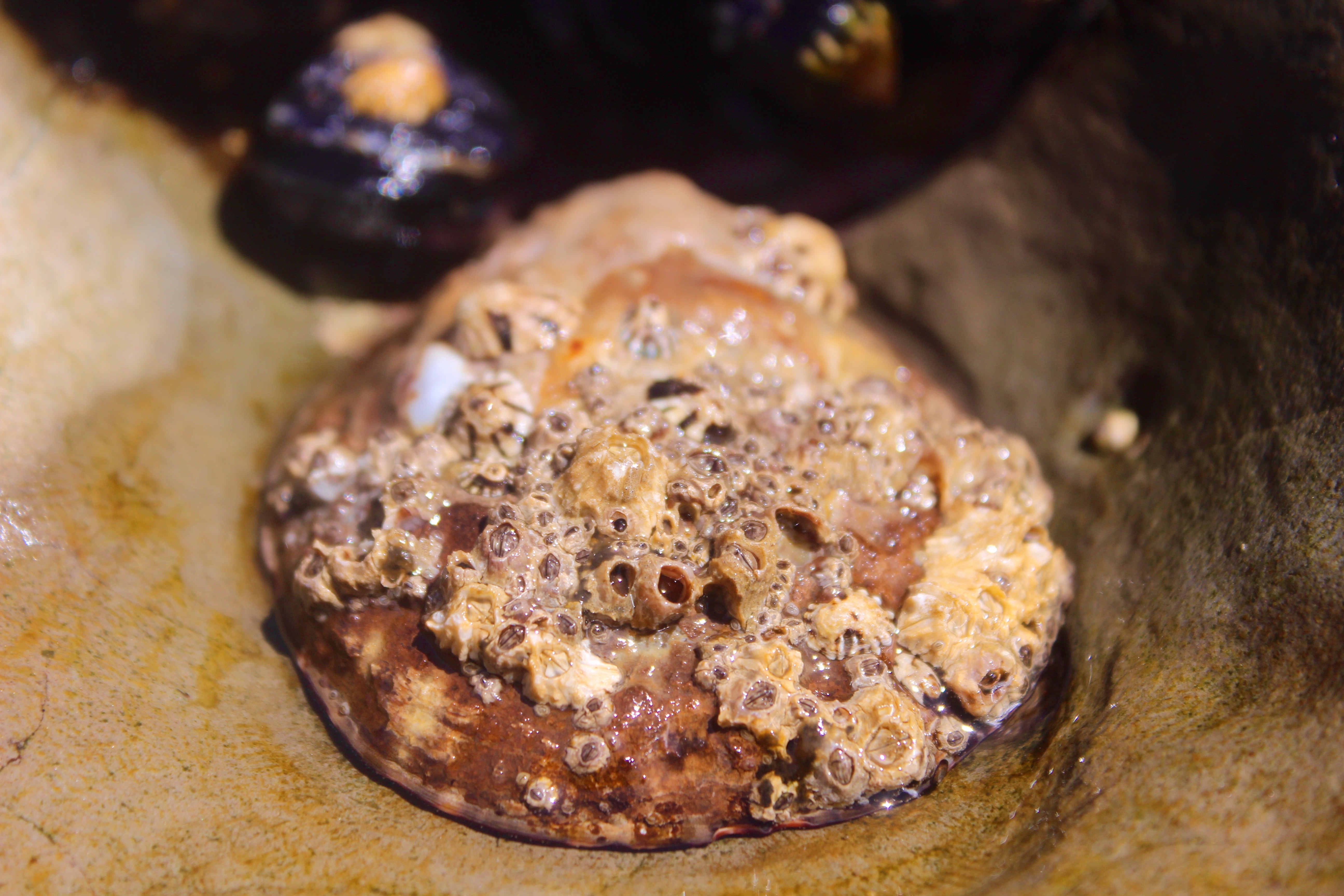 Today’s urban tidepool exploration begins as I kneel next to a patch of barren rock occupied solely by a squat, snail-like creature. She is a female Owl Limpet (Lottia gigantea), with ridges and barnacles texturing the top of her conical, chicken-egg-sized shell.