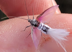 I held up my hand in the vicinity of one of these tiny floating "feathers" and as it landed I could see wings and legs