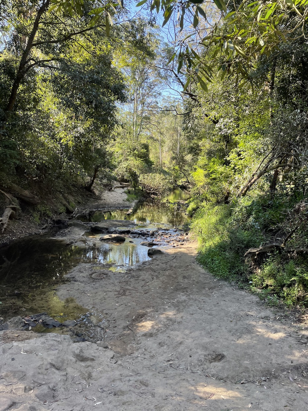 After the 20-minute walk through roads, avenues and side streets, my brother and I arrive at the beginning of the trail. I notice the transition from suburbia to nature as the concrete path becomes more and more engulfed in dirt with every step. After a very steep and winding track, we find ourselves in a valley of sorts, where the air is damp and cooling and the trees create a sky high canopy. This would be especially refreshing in Summer. Here, there is also a creek which is quite still and muddy.