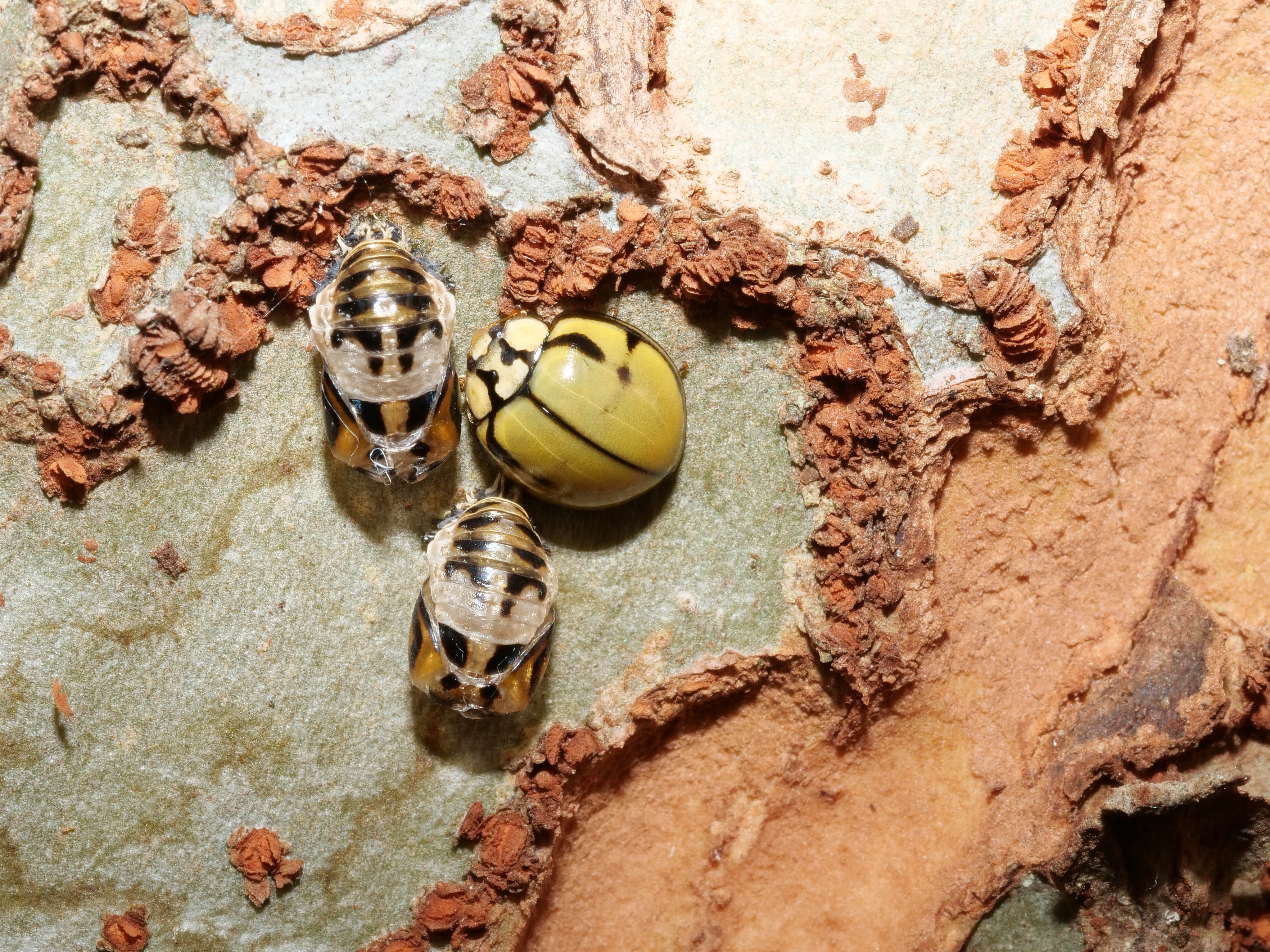 A different kind of bird caught my interest too, a Ladybird! On the walk there is a Chinese Elm (Ulmus parvifolia), a street tree with lovely bark that is the home to many creatures including at least three species of Ladybird beetles, one of which, the Tortoise-shelled Ladybird (Harmonia testudinaria), seems to live out a good part of its one to two months of life right there. Like all beetles or Coleoptera, ladybirds undergo four stages of life - egg, larva, pupa and adult. Over the period of Covid-19 lockdown, these stages have played out before me as the daily exercise takes me past this ecosystem on a tree trunk.