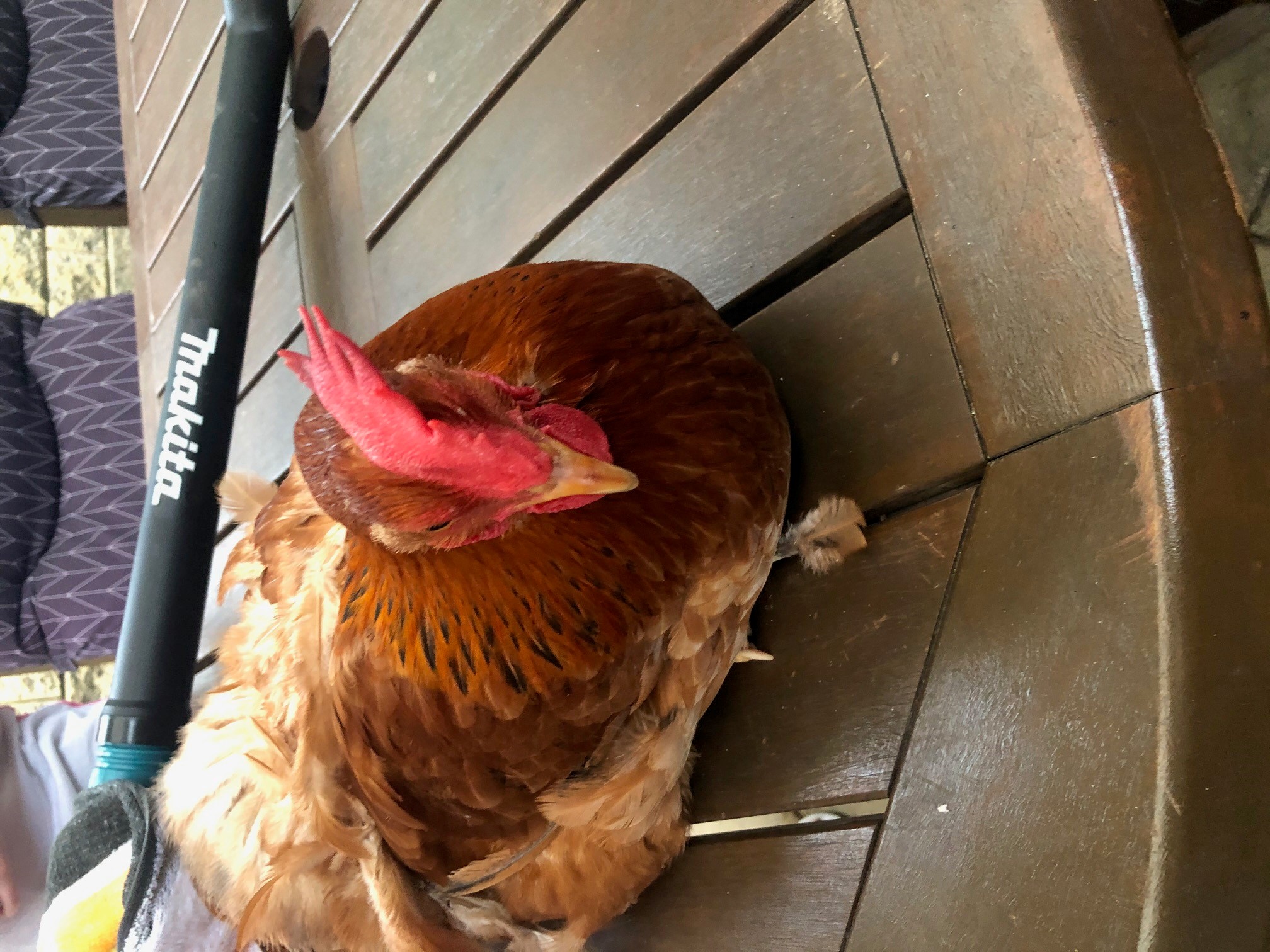At night they live in their house which is rather large for only four hens and every day at 7am in the morning they are let out by an electric door which shuts at 7pm. On Sunday morning at exactly 3 past 7 there was an enormous racket out the back and Maddison yelled out “MUM THERE’S A FOX AND ITS GOT NUGGET”. Kim ripped open her bedroom curtains and saw the fox carrying our poor brown hen across the grass. Before she could get to the backdoor and rush out, the fox had darted across the yard, she saw it jump up and onto the top of the back fence, which is 5 feet high, with poor Chicken “Nugget” in its mouth. Luckily it slipped and let go and released the very frightened bird. A great deal of stress and expensive medical attention later Nugget, I’m proud to say, was a very lucky hen and lived to lay another day.