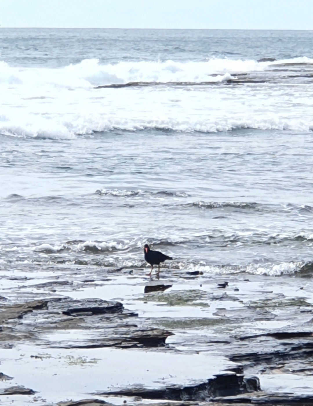 I've seen this bird in a group. They waddle fast and then slow after one another on the platform, watching shallow pools, running toward the waves exploding against the shelf and prancing in the whitewash on the rock that reveals the best food. They nudge detritus aside with that beak - an orange lever lifting and prising and digging in an industrious search for food.